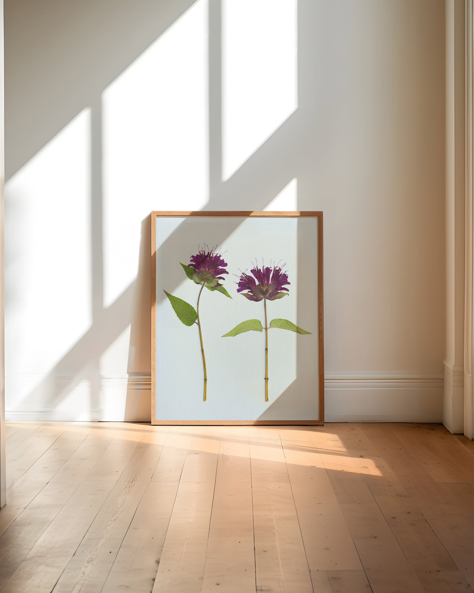 Bee Balm Bloom captures the vibrancy of pressed bee balm, its petals fanned in a burst of soft magenta against light blue paper. Known for its wild, firework-like form, the flower radiates both movement and calm when stilled in preservation.