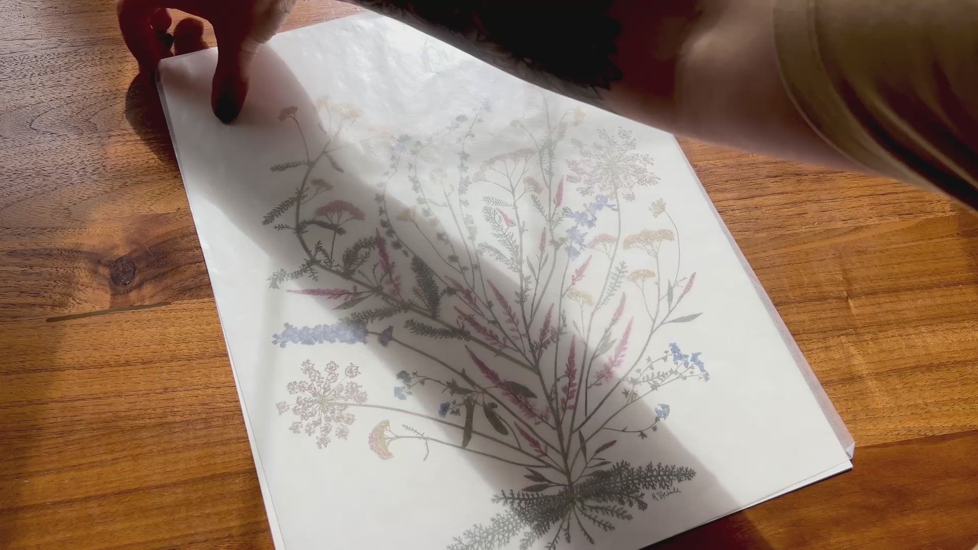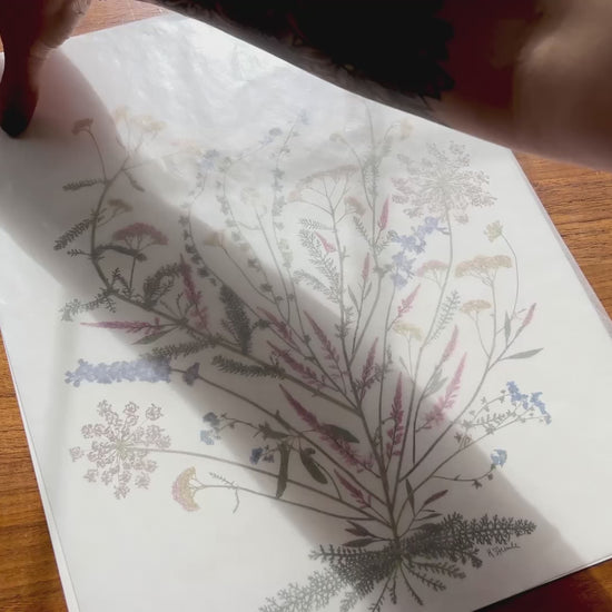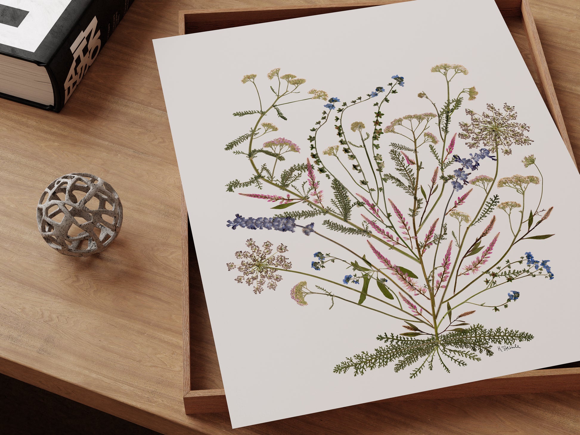 Made from pressed flowers, this piece captures the essence of a meadow bouquet in full bloom, with soft pinks and blues that invite a sense of presence and peace.