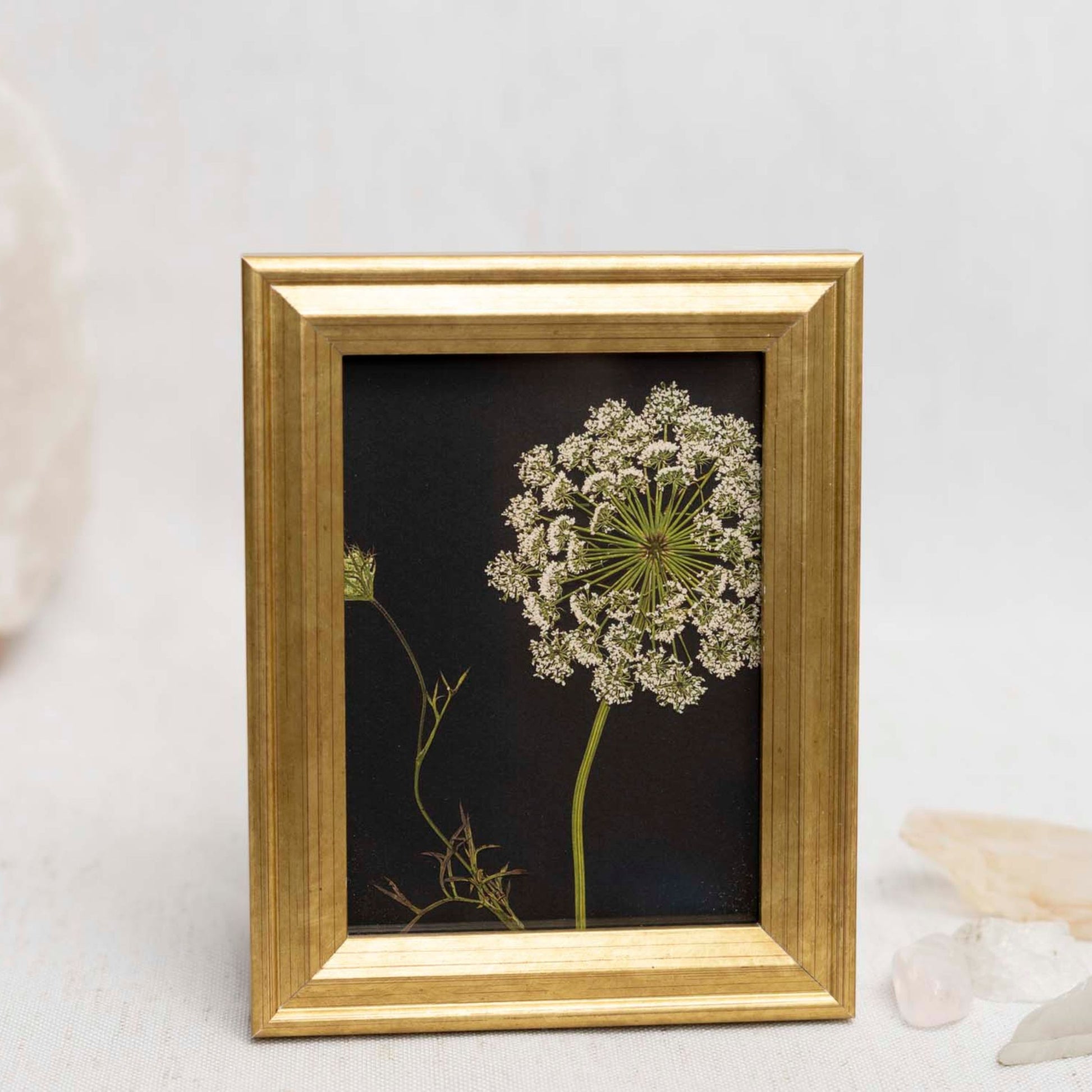 Lace & Light features Queen Anne’s Lace pressed in full bloom, its petals arranged like lacework—this composition captures both delicacy and strength in perfect harmony.