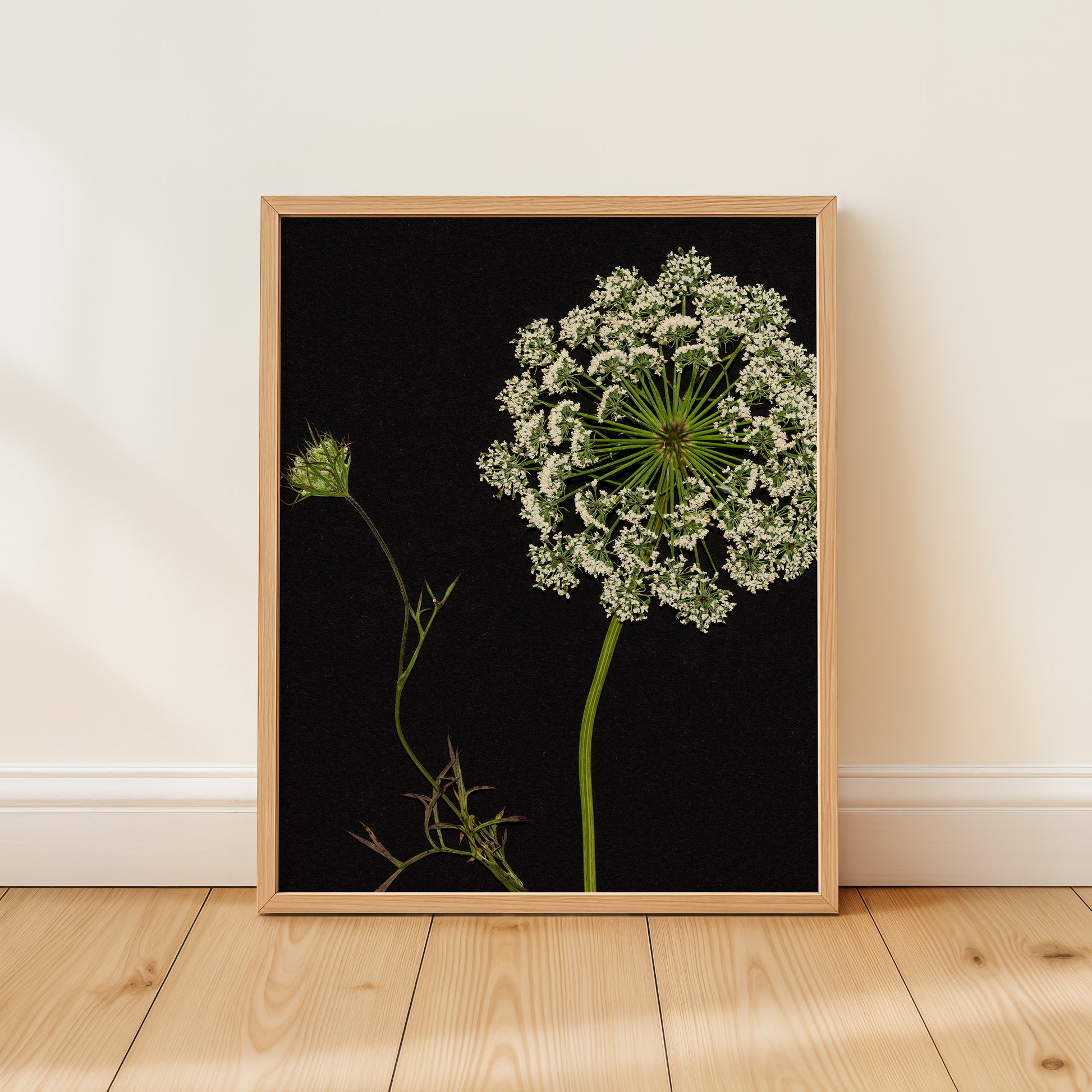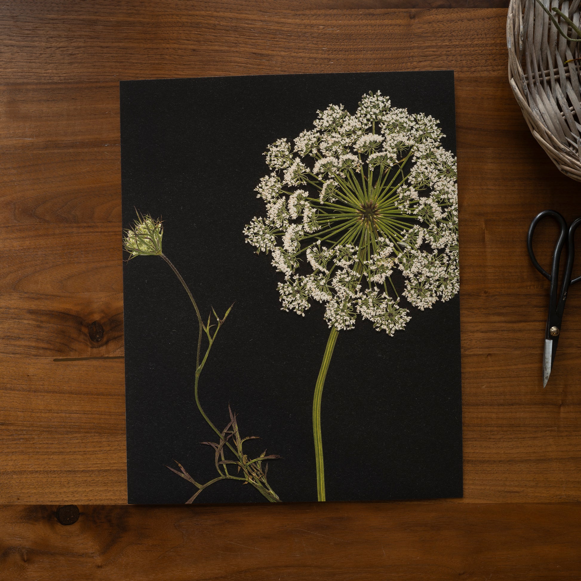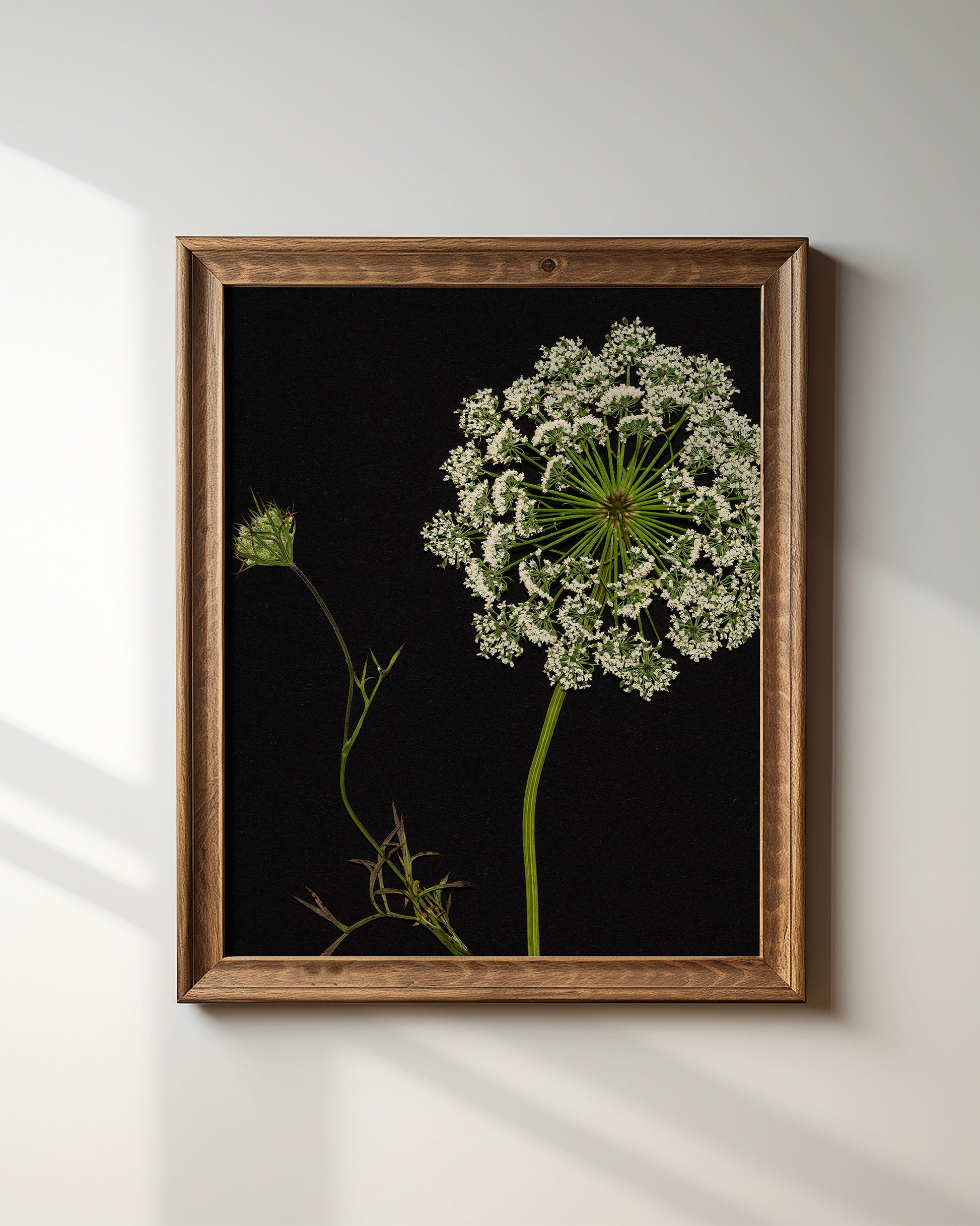 Lace & Light features Queen Anne’s Lace pressed in full bloom, its petals arranged like lacework—this composition captures both delicacy and strength in perfect harmony.