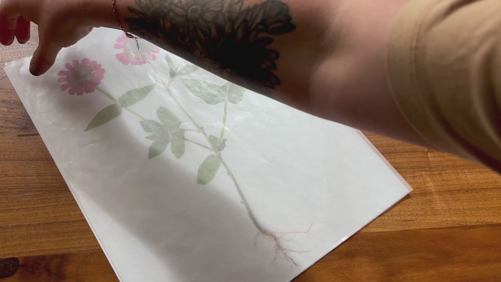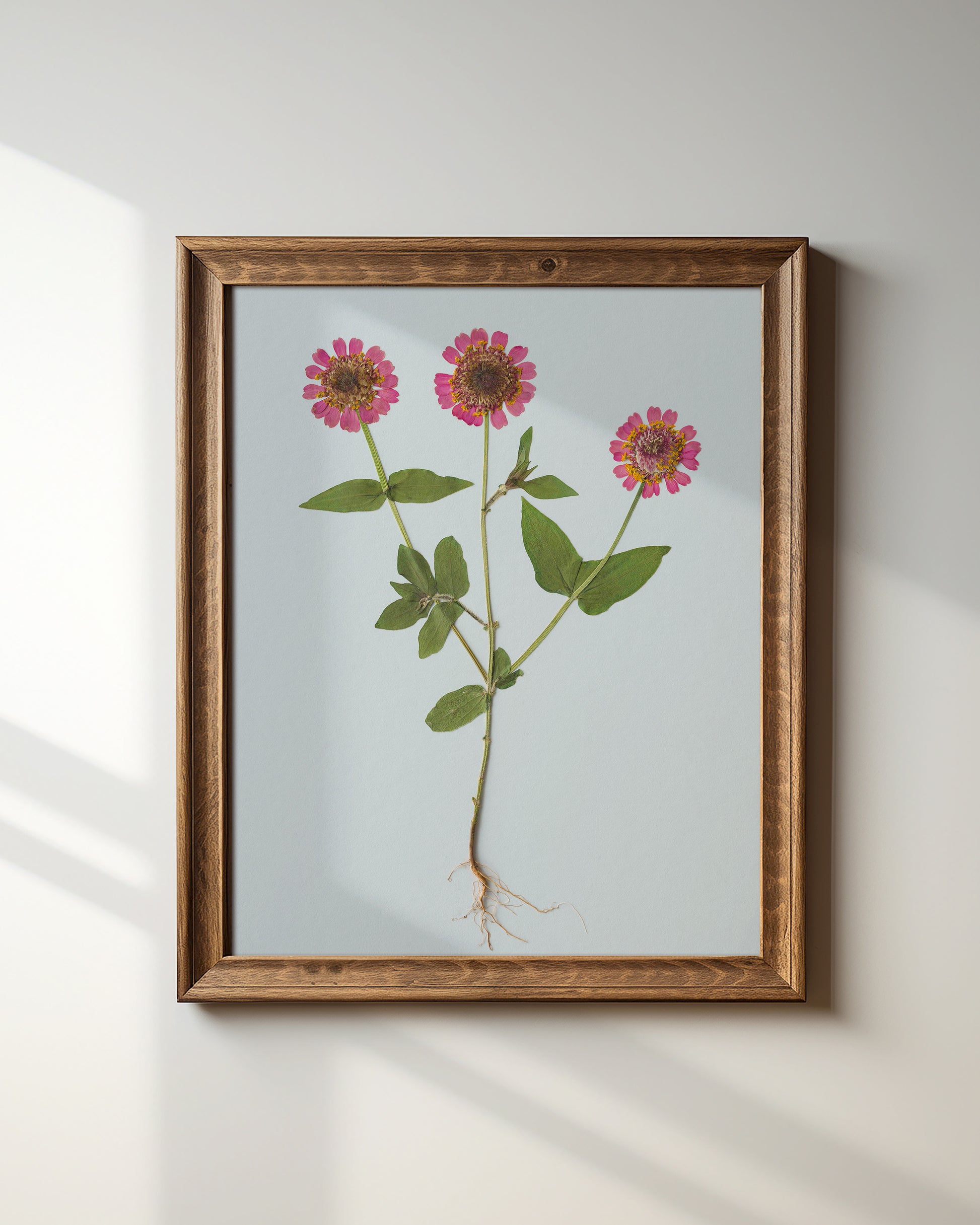 Pressed pink Zinnia's rise together on slender stems, their roots trailing below like quiet threads of memory.