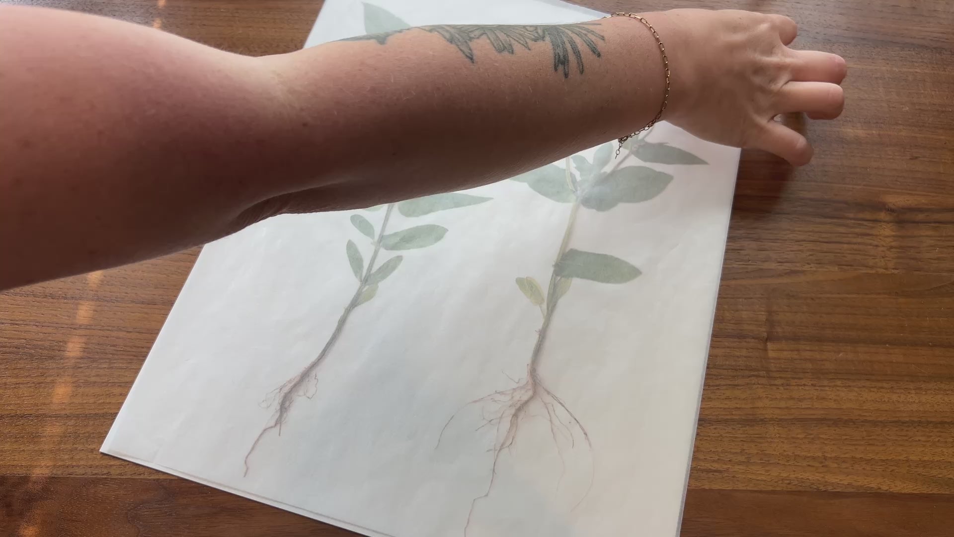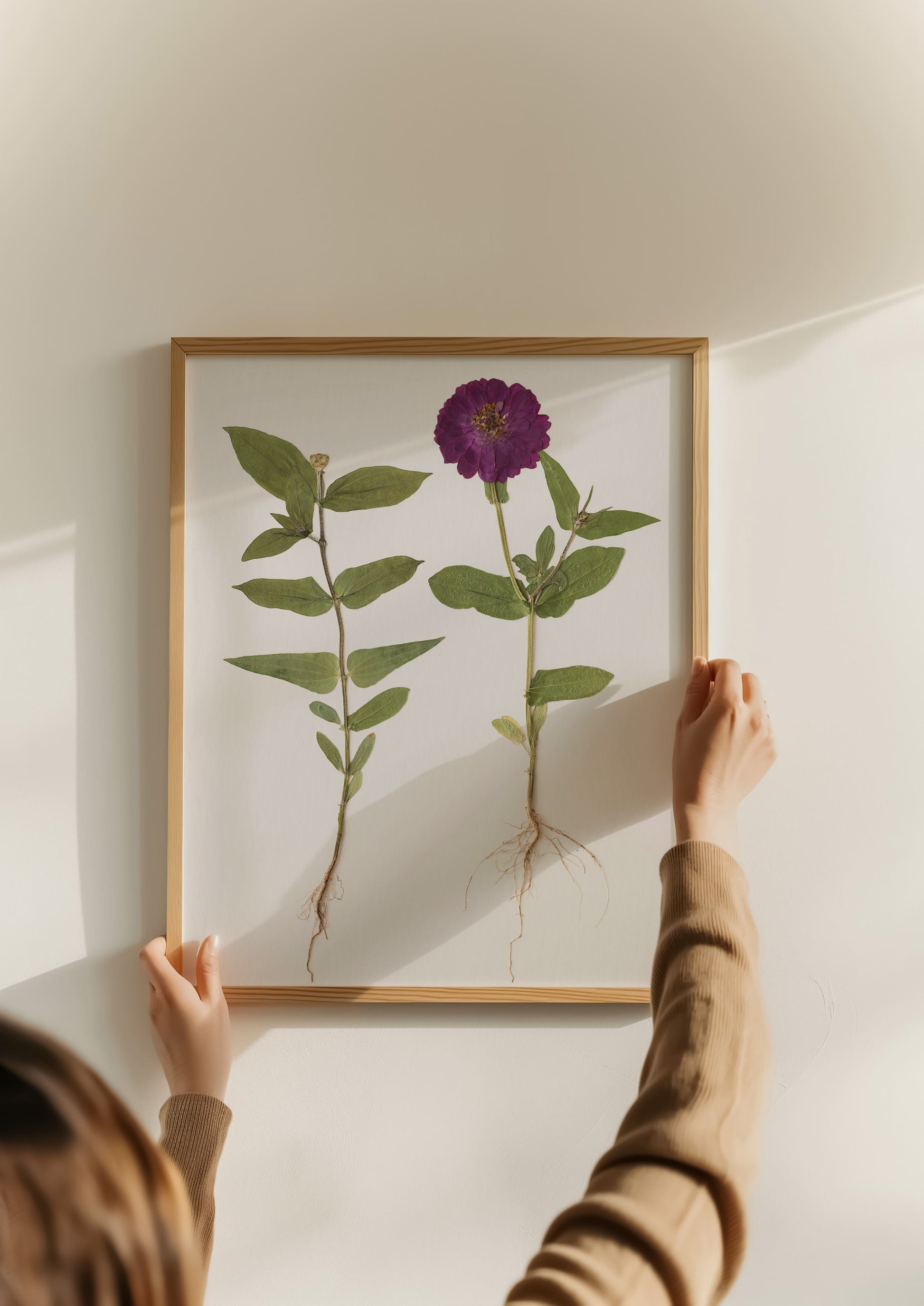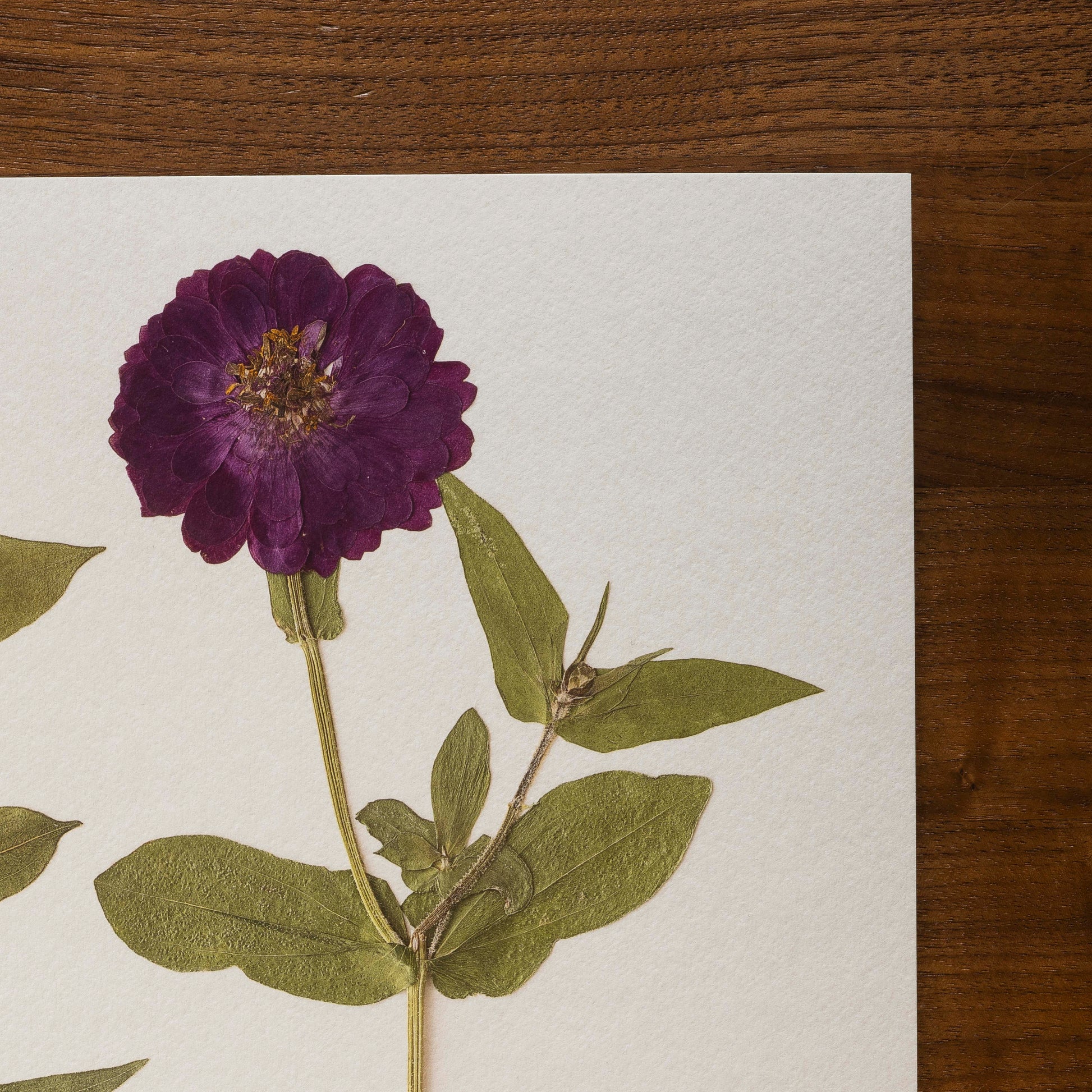 A pressed purple Zinnia & Zinnia bud with its roots intact, stands tall against soft cream paper—grounded, graceful, and full of color.