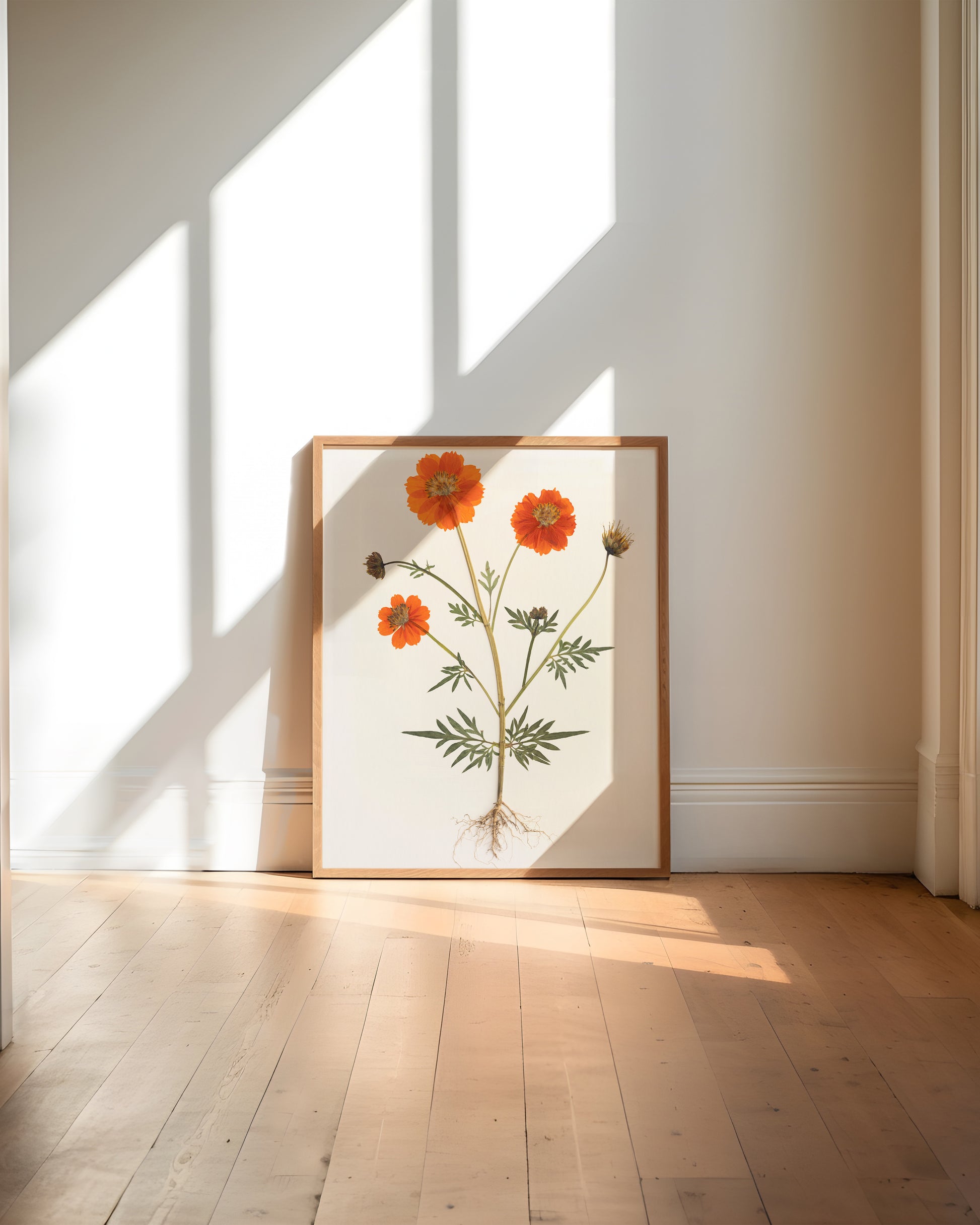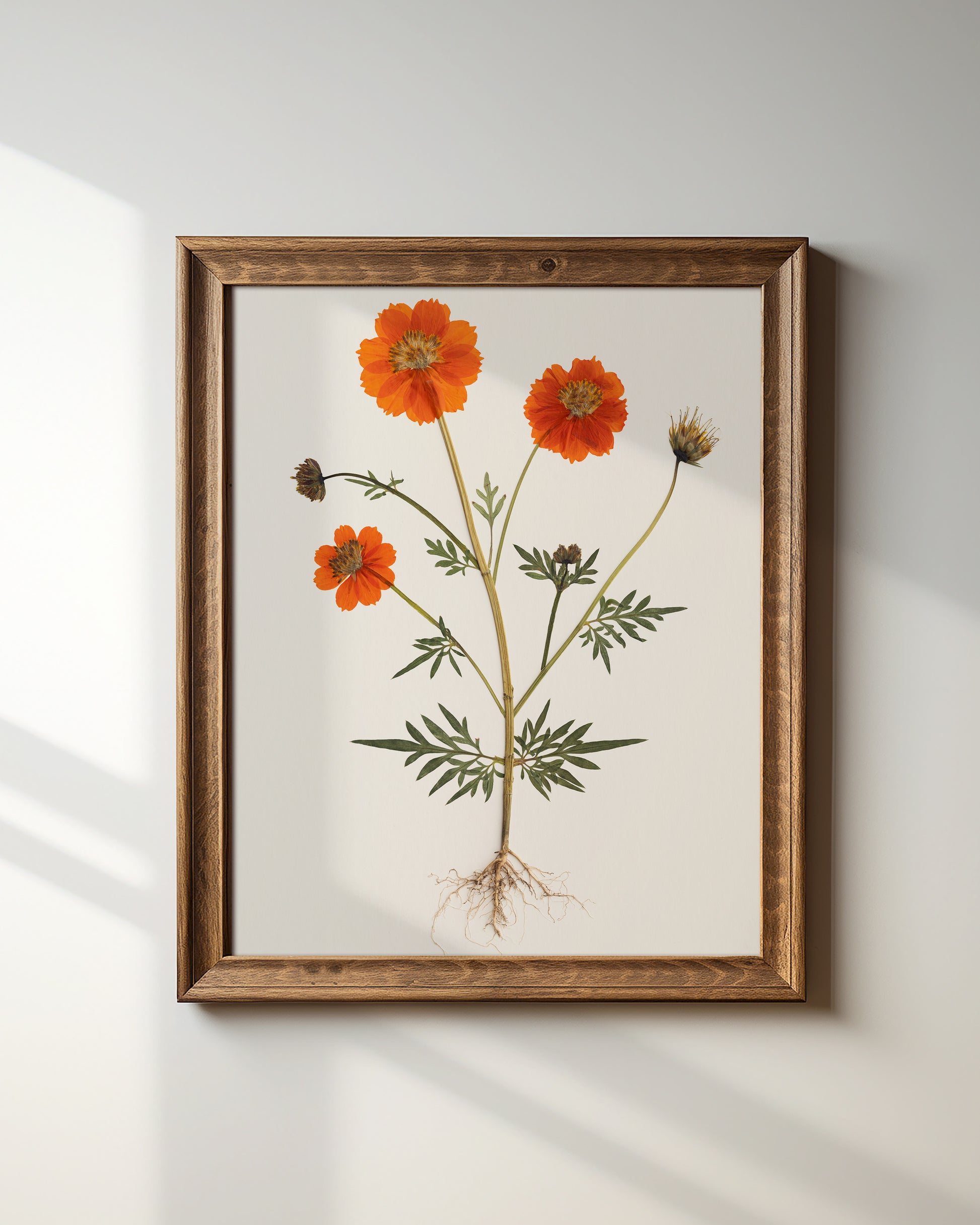 A pressed orange Cosmos flower rests gently against soft cream paper—its roots trailing below in delicate detail.
