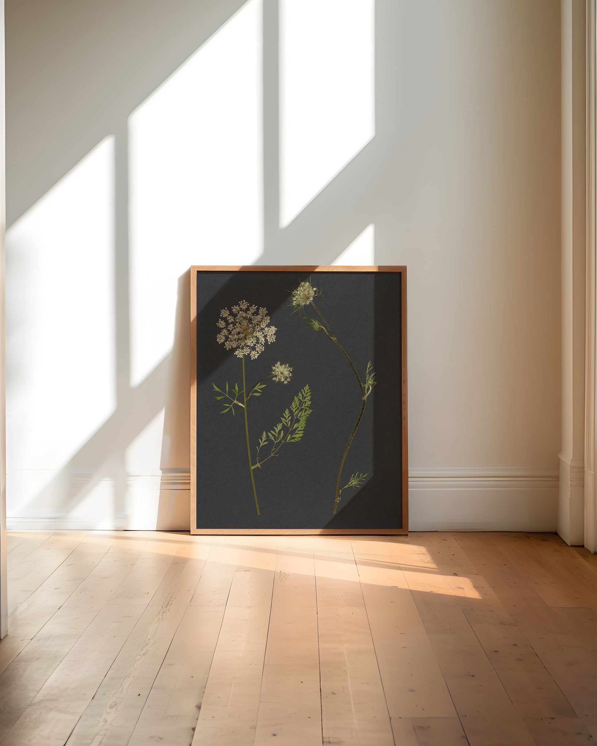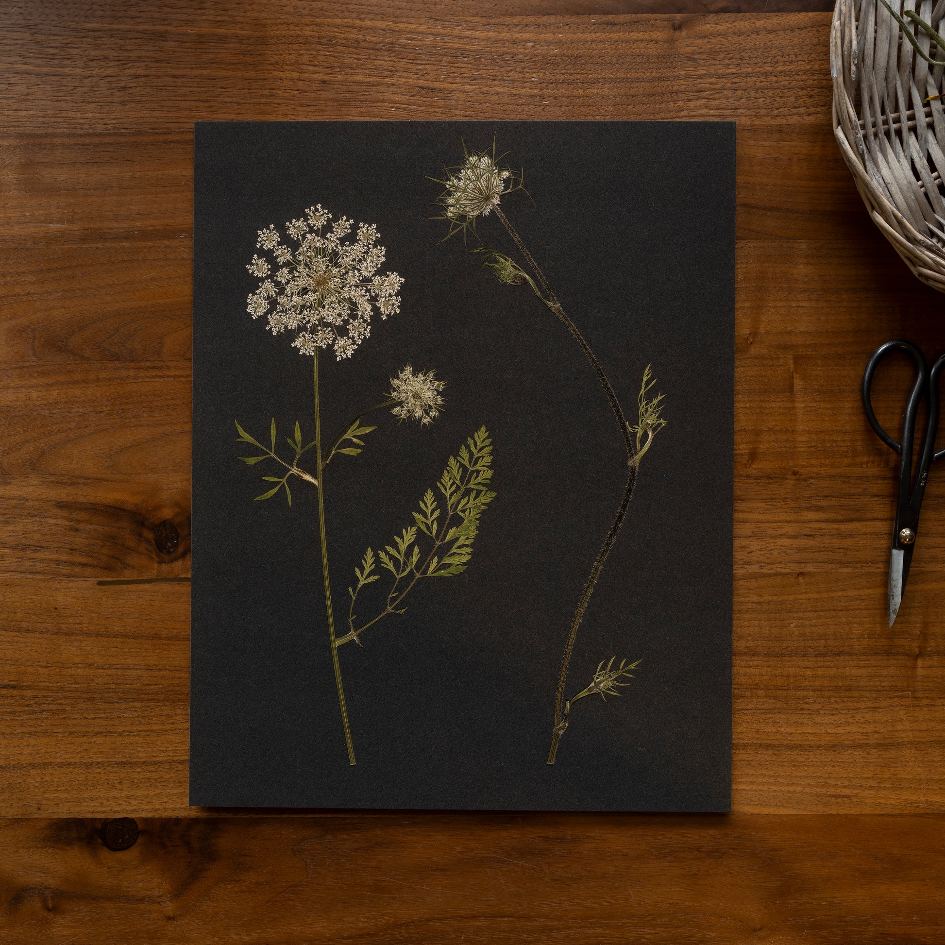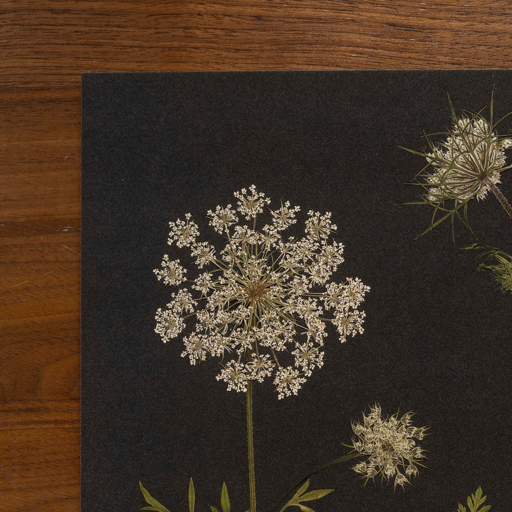 Summer Lace II continues the study of Queen Anne’s Lace, its delicate blooms pressed against a black background where every detail shines like lacework in shadow and light.