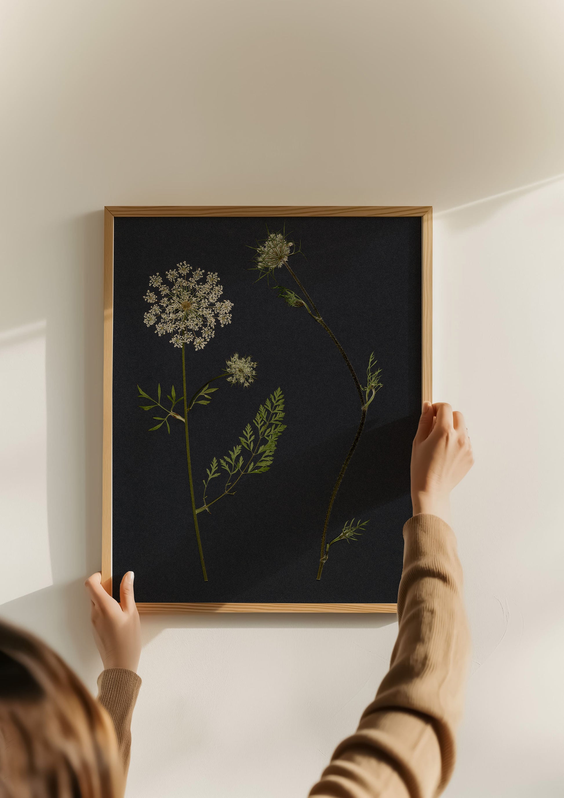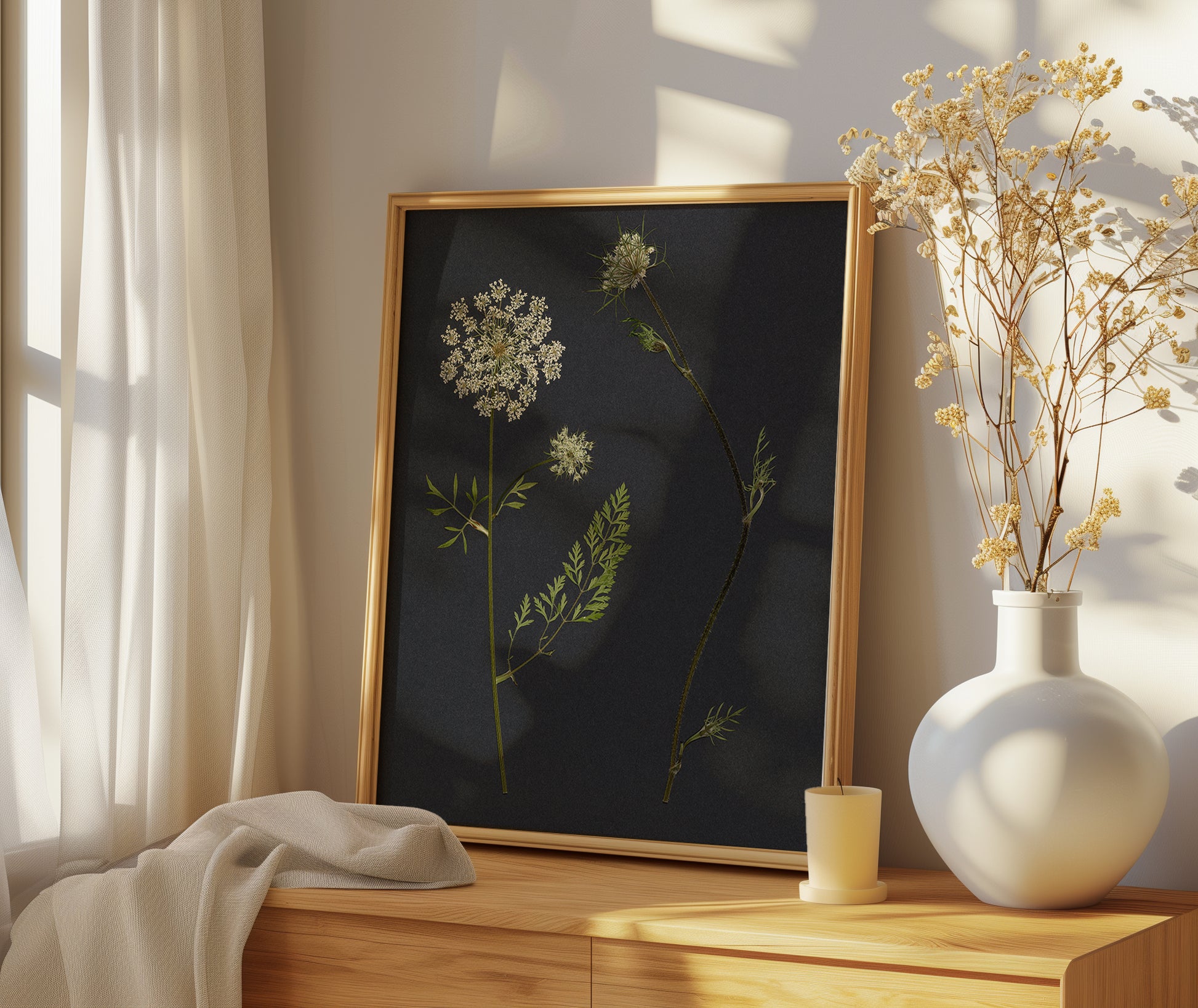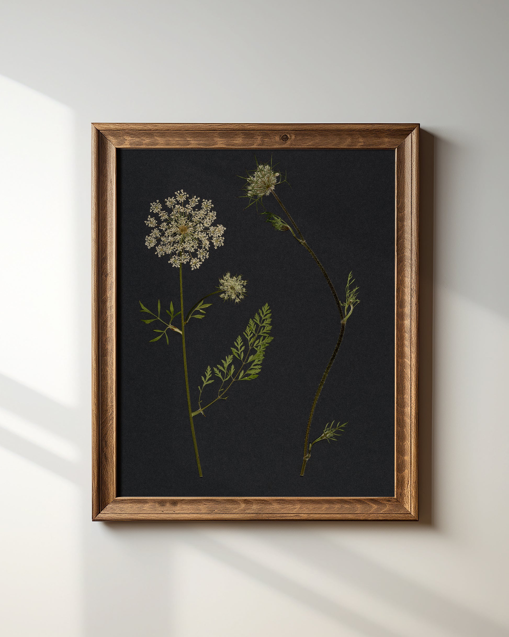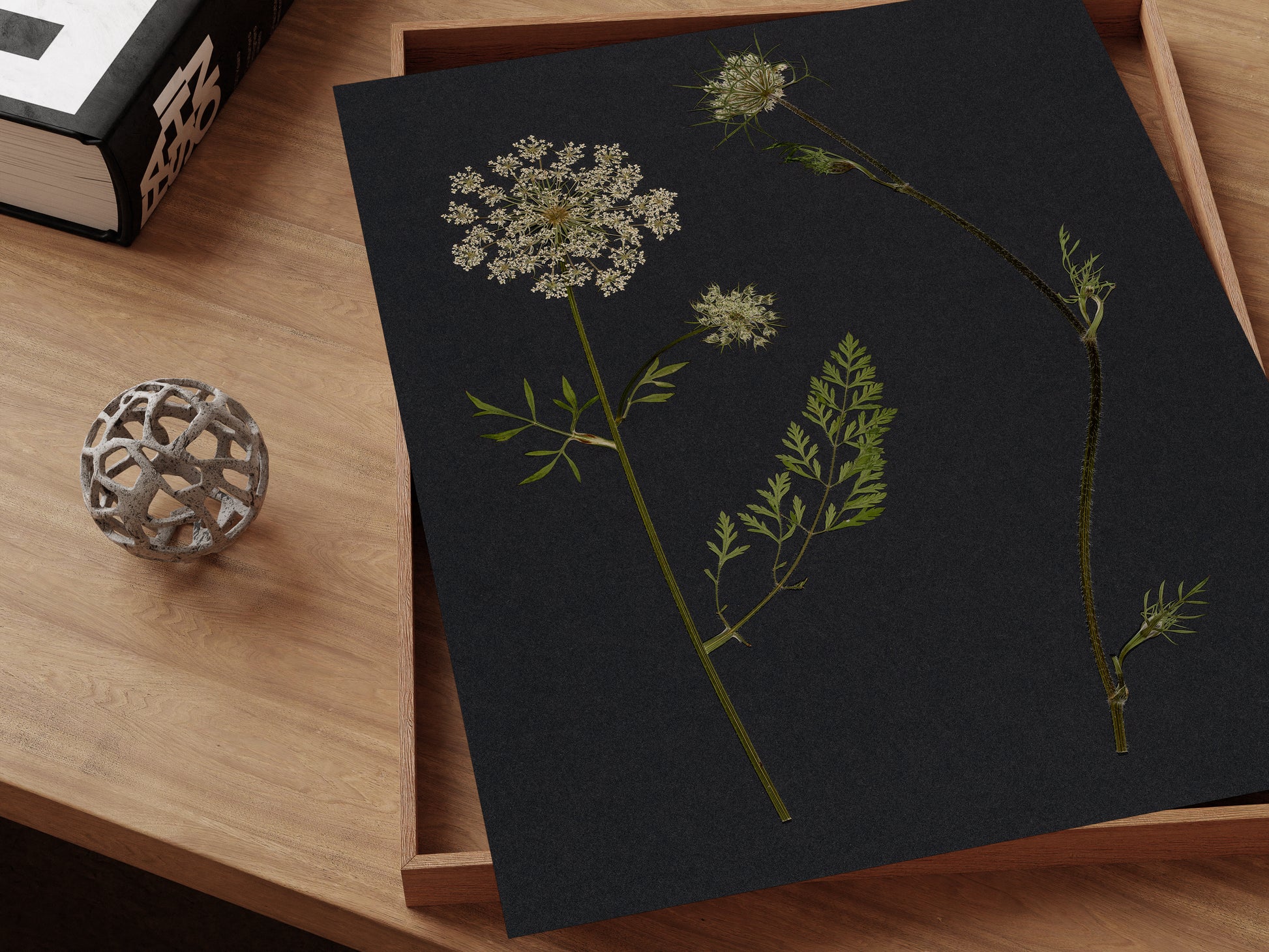 Summer Lace II continues the study of Queen Anne’s Lace, its delicate blooms pressed against a black background where every detail shines like lacework in shadow and light.