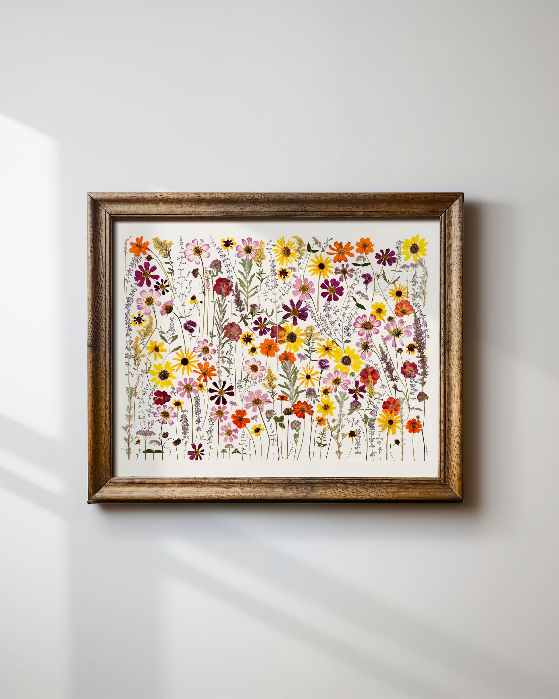 A celebration of summer’s untamed beauty, Wildflower Whimsy bursts with life in a patchwork of color and texture. Flowers pressed from the garden—sunflowers, cosmos, lavender, and more—this piece radiates joy and inspiration.