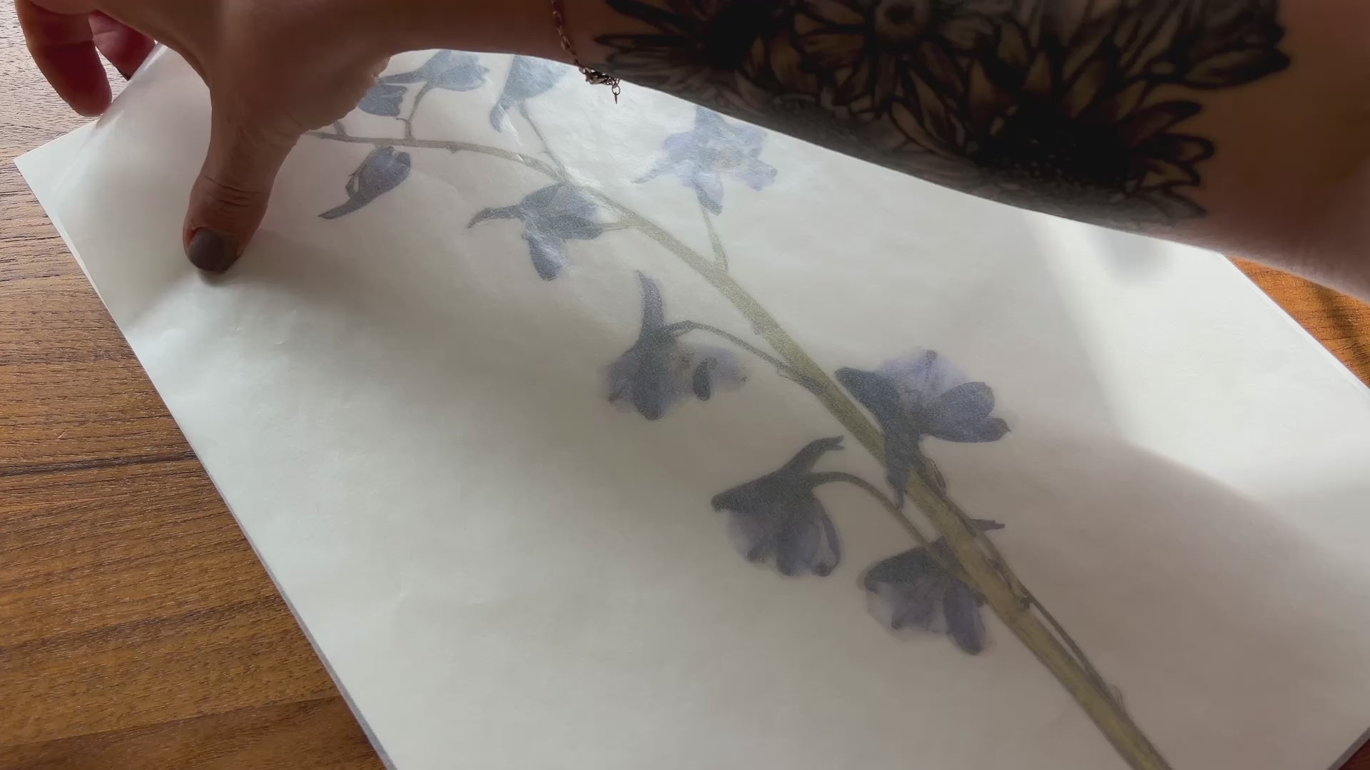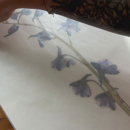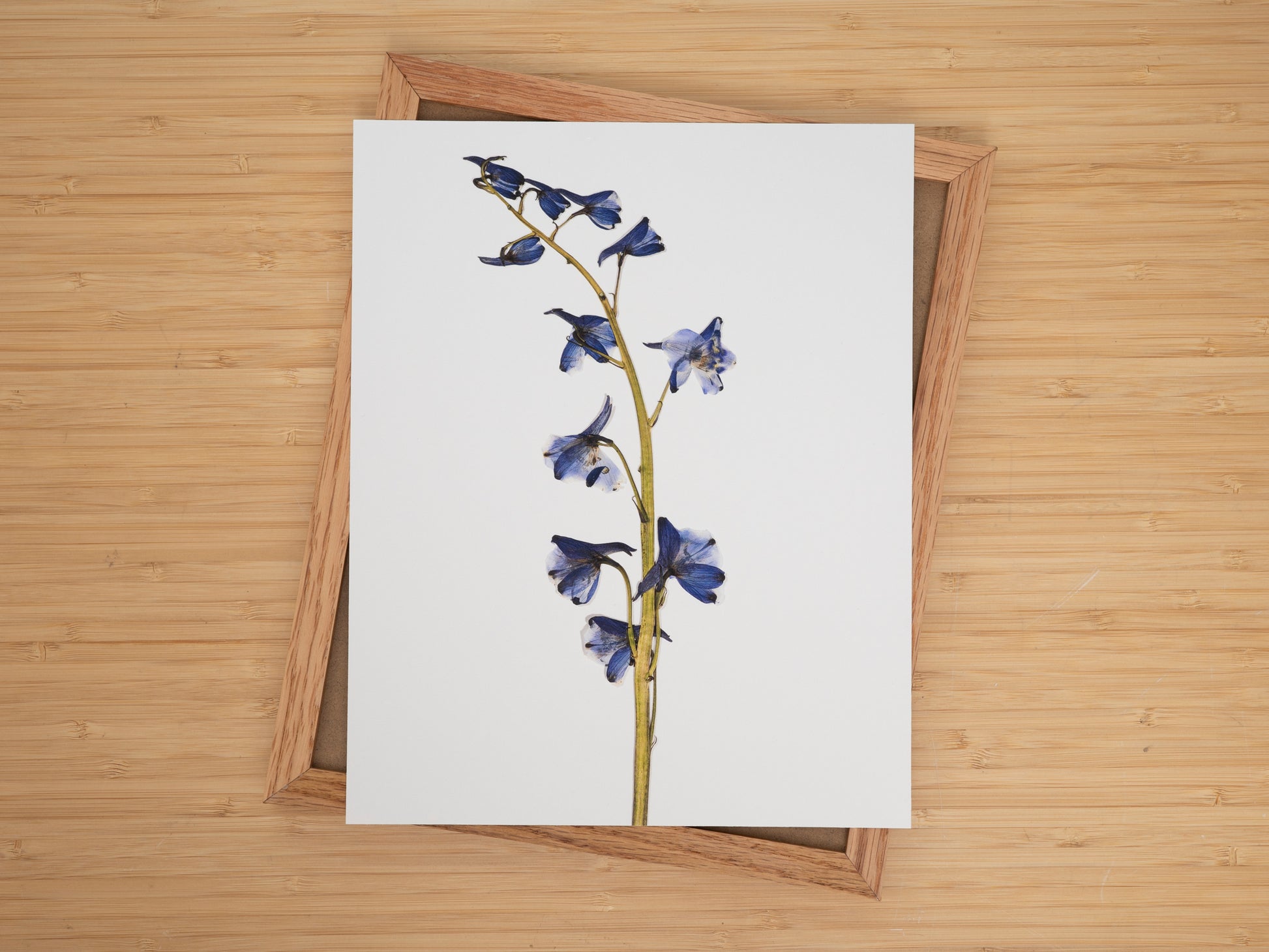 Wistful Blue captures the beauty of a single pressed delphinium. Shades of blue and muted violet bring a sense of calming inspiration. A perfect piece to bring beauty & inspiration into your space.
